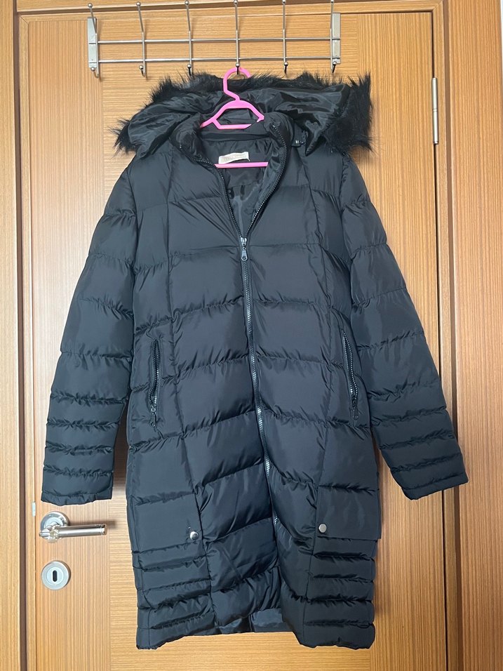 Kürk detaylı kapüşonlu, uzun siyah mont. Yumuşak ve sıcak kumaştan, günlük kullanım için uygundur. ❄️