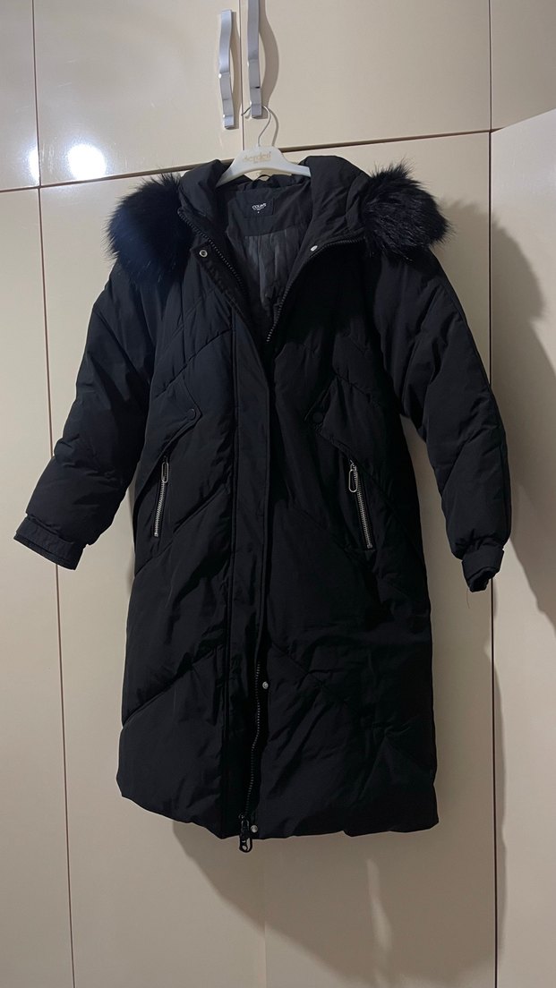 siyah uzun kışlık mont, s yazıyor ama kalıp bol kürk detaylı kapüşon ve kesik yaka ile dikkat çeker. Yumuşak ve sıcak kumaştan, günlük sokak stili için uygun. ❄️
