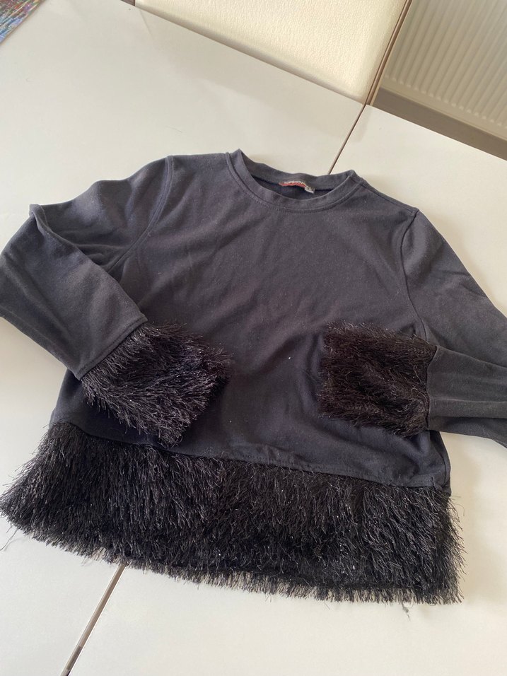 Siyah renkli, uzun kollu ve bisiklet yaka kadın kazak, kollar ve etek kısmında kürk detaylarına sahip, bol ve rahat kesimlidir.