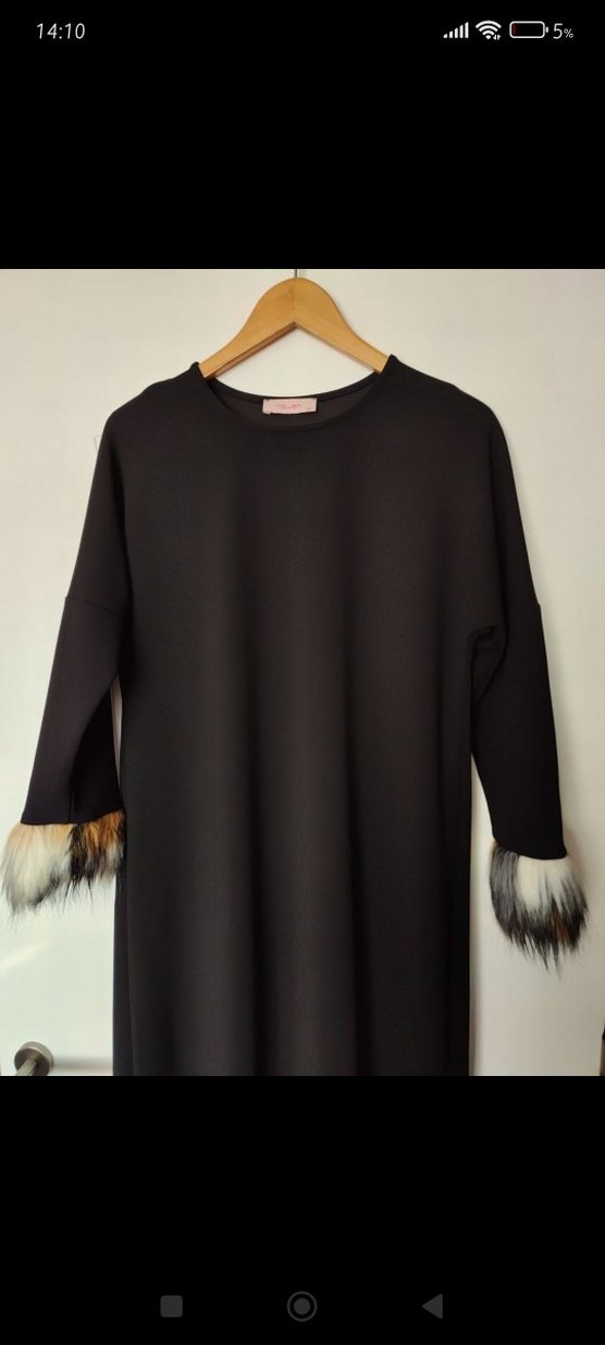 Kürk detaylı kol manşetleri ve bol kesimli siyah uzun tunik. fotoğraflarda göründüğü gibidir, rengi canlı siyah. çok az kullanıldı,bir kere yıkama talimatlarına uygun şekilde temizlendi,butik ürünudur. koltuk altından eni 51cm omuz hizasından boyu 111 cm