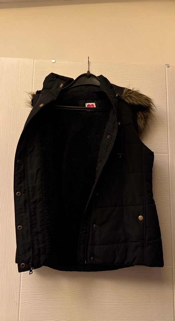Kürk detaylı, siyah, kolsuz yelek. Yumuşak ve sıcak kumaştan, notched lapel yakalı, midi boy ve fitted kesim sokak tarzı için uygun.