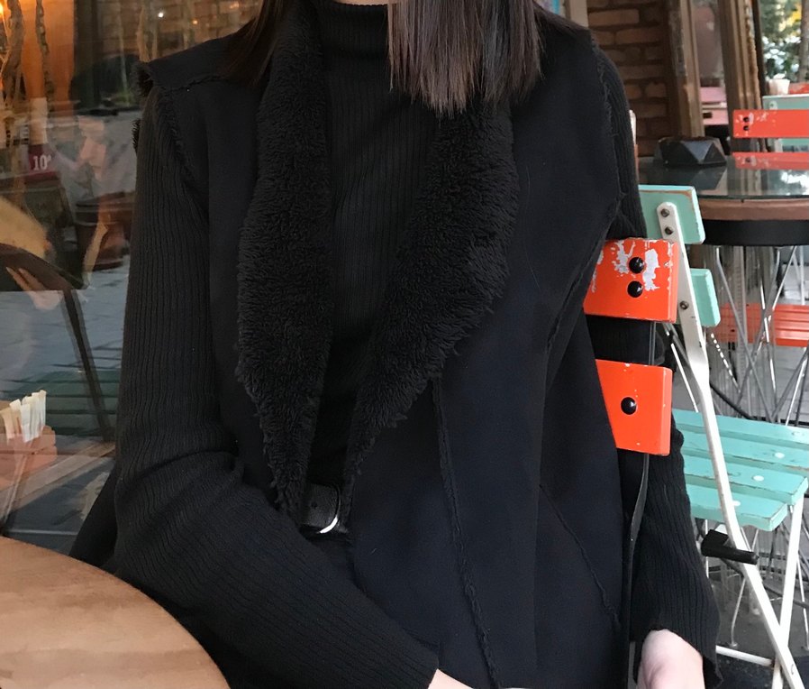 Kürk detaylı, yumuşak tüylü siyah kadın yelek.Notch yaka, askılı kollu ve midi boyda, sokak stiline uygun rahat kesim.