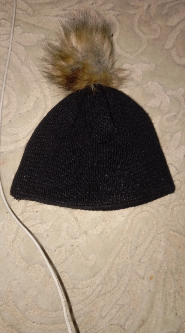 siyah yünden yapılmış, kürk ponpon detaylı bere. Sıcak tutar ve trend sokak stiline uygundur.