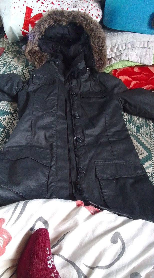 Kürk detaylı kapüşonlu, uzun kollu, siyah midi mont. Yumuşak sentetik kumaştan, rahat ve gotik tarzda günlük kullanım için uygun.