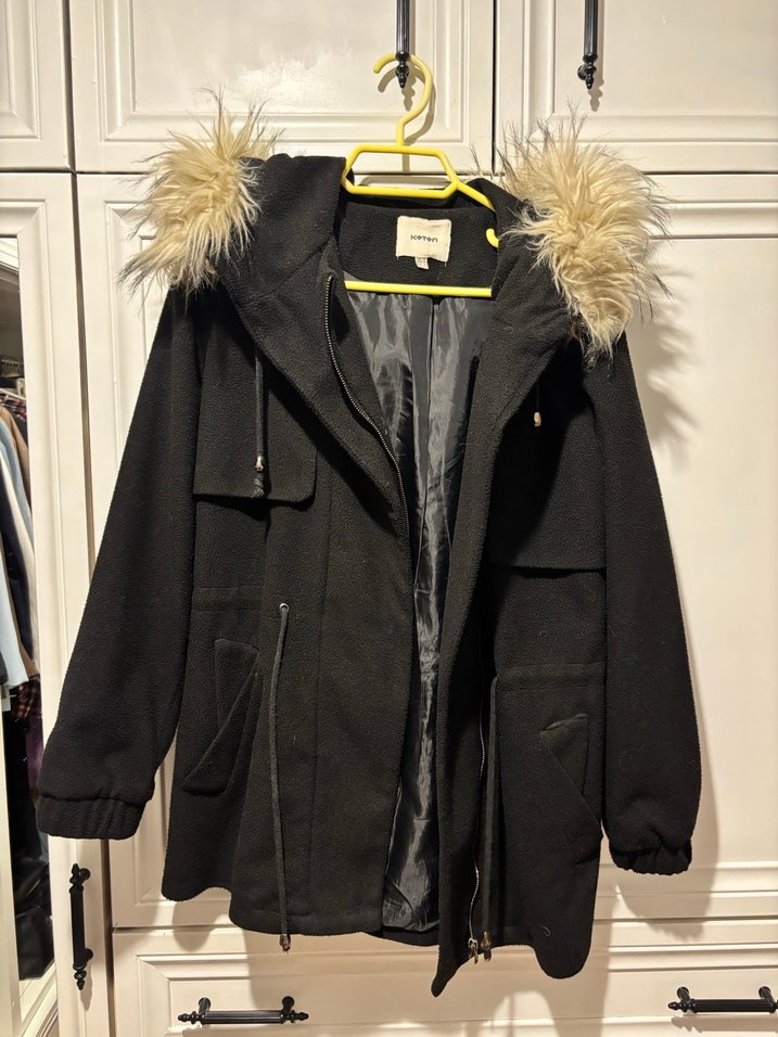 Kürk detaylı kapüşonlu, siyah, normal boy midi uzunluğunda, uzun kollu, fitted kesim kadın mont. Günlük kullanıma uygun, rahat ve şık.