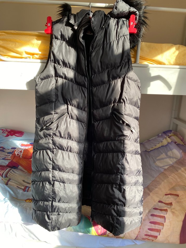 Kürk detaylı, yüksek yakalı siyah kadın yelek. Yumuşak sentetik kumaştan, dar kesim ve midi boyda, günlük sokak stiline uygun.
