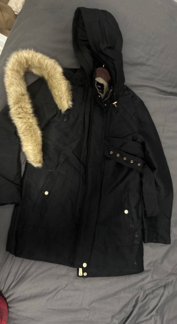 Siyah, kürk detaylı, normal midi boyda, uzun kollu, yumuşak ve sıcak kumaştan, sokak modasına uygun, fitted kesim ceket. Bana küçük geldiği için satıyorum. Şapka Lastiğinin aparatı çıkmış, sol cepte de sobaya degdigi için ufak bir deforme var fotoğrafta göstermeye çalıştım