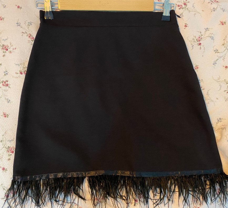 Kürk detaylı siyah mini etek, sentetik kumaştan ve vücuda oturan kesimde. Gotik Paris tarzını yansıtır, romantik akşamlar için uygun.