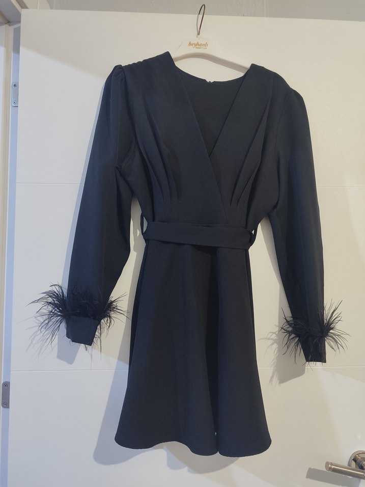 Siyah, v yaka, kürk detaylı uzun kollu mini elbise olarakta kullanılabilir dar kesim ve şık tasarımıyla parti için uygun. ikili tesettür takım şeklindeydi pantolon kullanıldı fakat üstü olmadı