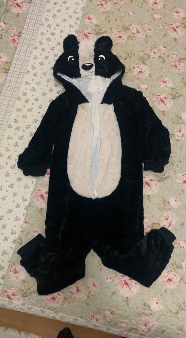 Kürk detaylı siyah panda tulum kostüm kapüşonunda sevimli hayvan yüzü bulunur. Yumuşak ve rahat kumaştan yapılmıştır.