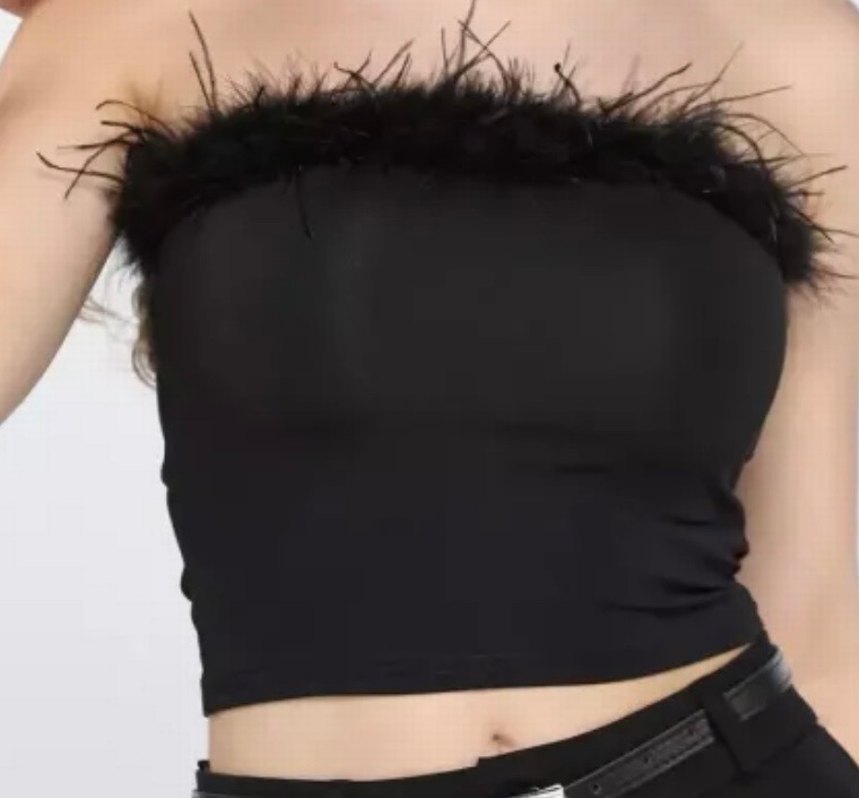 1 kez giyildi. Görseldeki gibidir. Üst kısmında kürk detaylı siyah kadın büstiyer, sentetik kumaştan üretilmiştir. Kürk detaylı, straplez yakalı siyah bustiyer. Sentetik kumaştan, gövdeye oturan kesime sahip, midi boyda ve kolsuzdur.