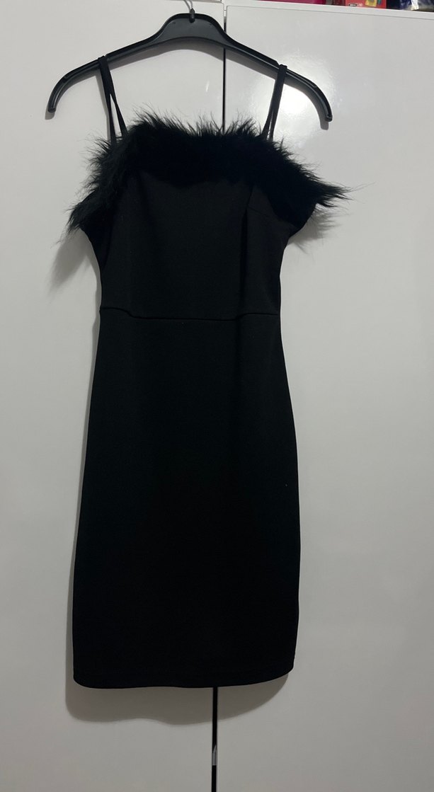 Kürk detaylı, siyah straplez mini elbise, gotik tarzı ve parti için uygun şık bir seçimdir. Sade ve vücuda oturan kesimiyle dikkat çeker.