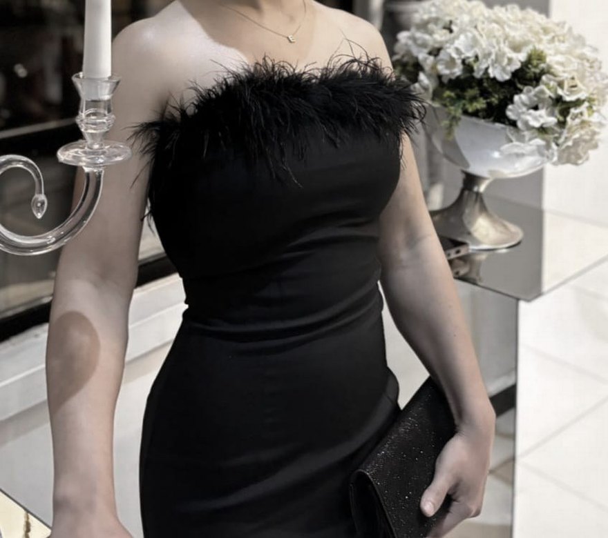 Kürk detaylı, siyah straplez uzun abiye elbise. Vücuda oturan kesimi ve kolsuz tasarımıyla şık ve gösterişli bir seçim. ✨