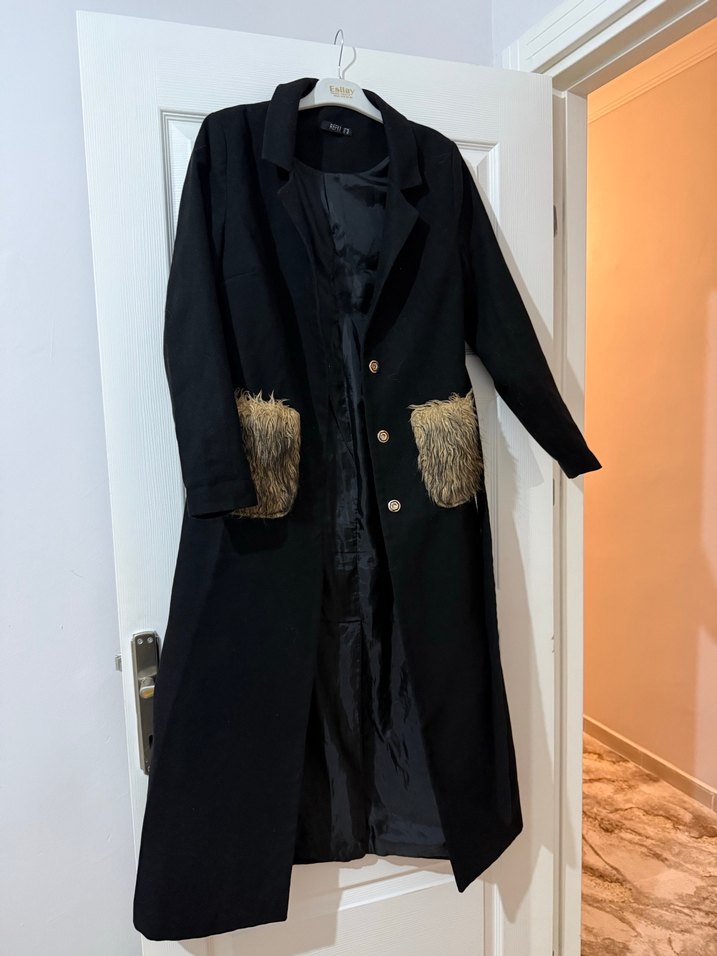 Siyah süet kumaştan yapılmış uzun kadın kabanı, kürk detaylı ceplere ve kesik yaka yakaya sahiptir. Uzun kollu ve regular fit olan bu kaban, Paris sokak modasına uygun şık bir tasarımdır.