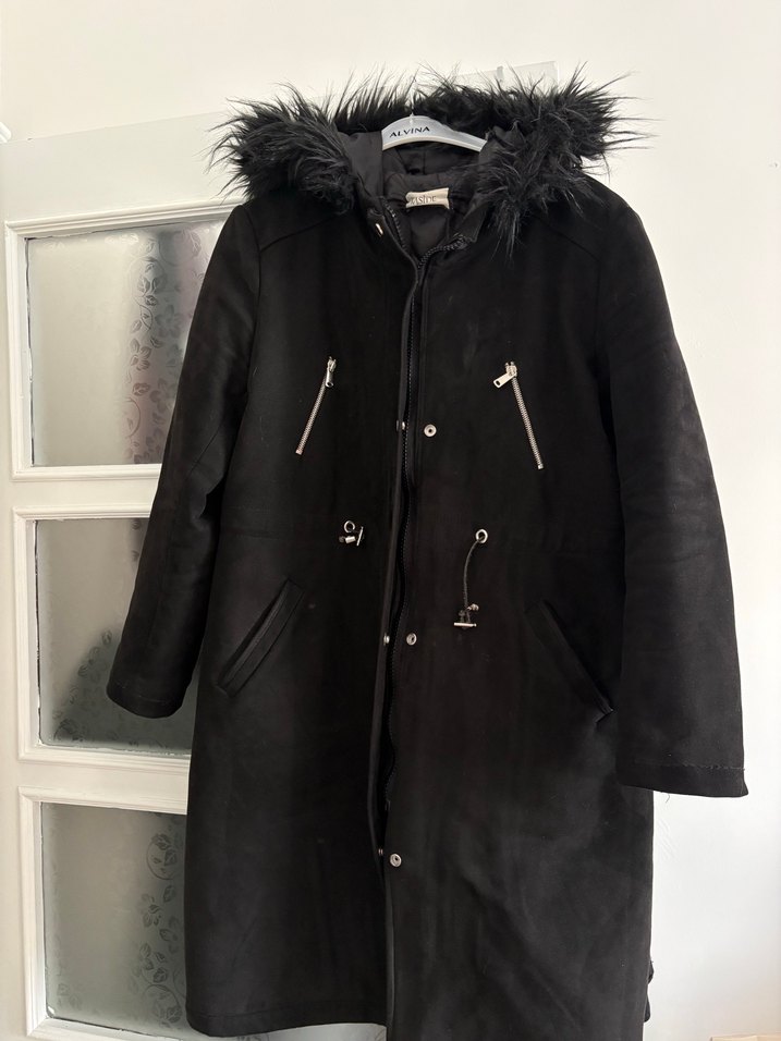 Siyah uzun kesim, süet kumaştan yapılmış, kürk detaylı kapüşonlu, strappy kollu ve yaka kısmı notched lapel olan kadın mont. Günlük kullanıma uygun. Hiçbir defosu yoktur.