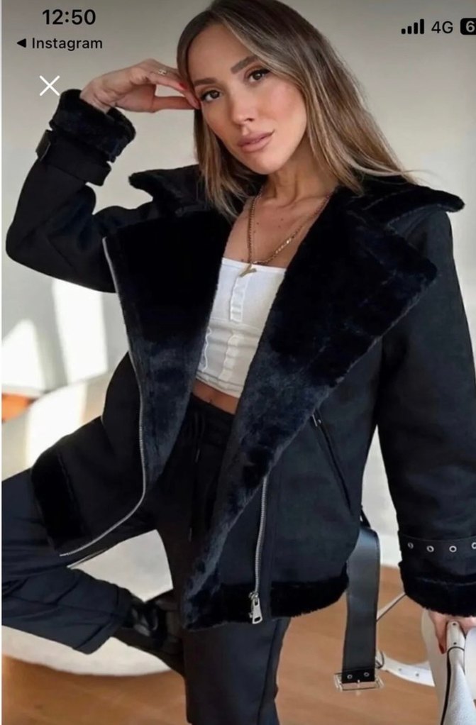 Kürk detaylı, siyah süet mini ceket, kısa boy ve fitted kesimle rahat sokak stili sunar. Notched lapel ve strappy kol detayları bulunur.