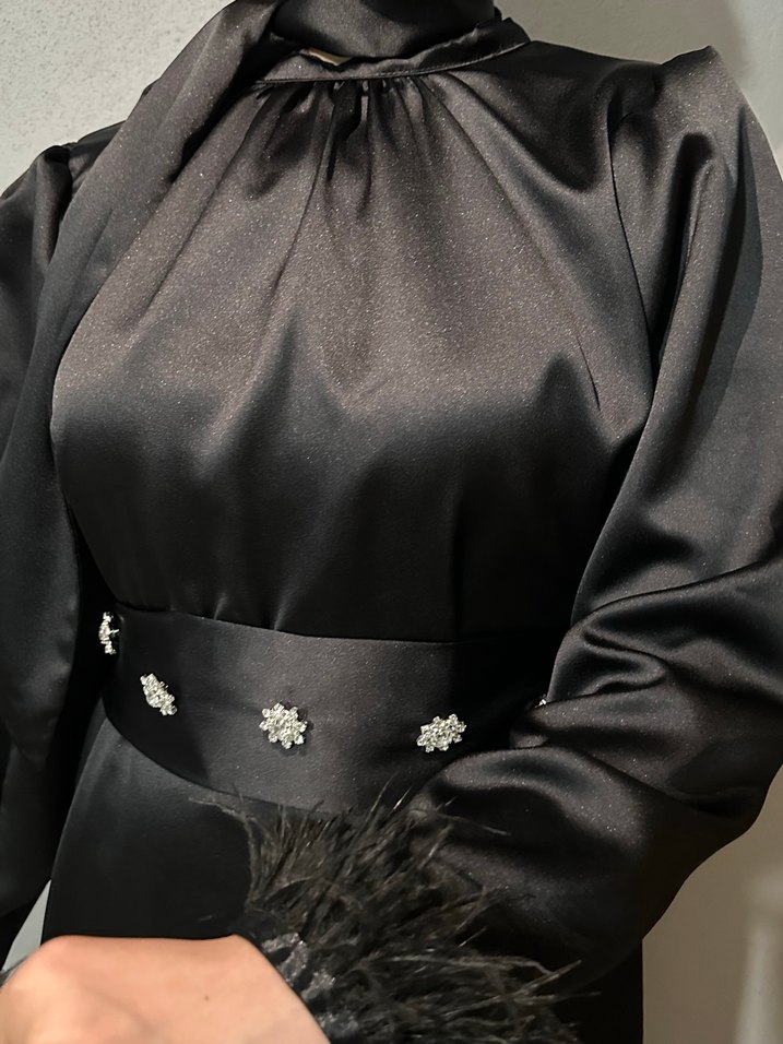 Kürk detaylı, yüksek yakalı siyah uzun abiye elbise. Strappy kollu, işlemeli parlak desenlere sahip, düğün için uygun klasik şıklıkta. Elbise boyu 137 cmdir, seyyar kemerlidir, 36-38 beden uyumludur.