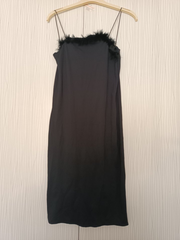 Bu siyah, vücuda oturan abiye elbise, askısız ve kürk detaylı üst kısmıyla dikkat çeker. Kolsuz ve uzun boyda, minimalist gotik tarzda, romantik akşamlar için uygundur.