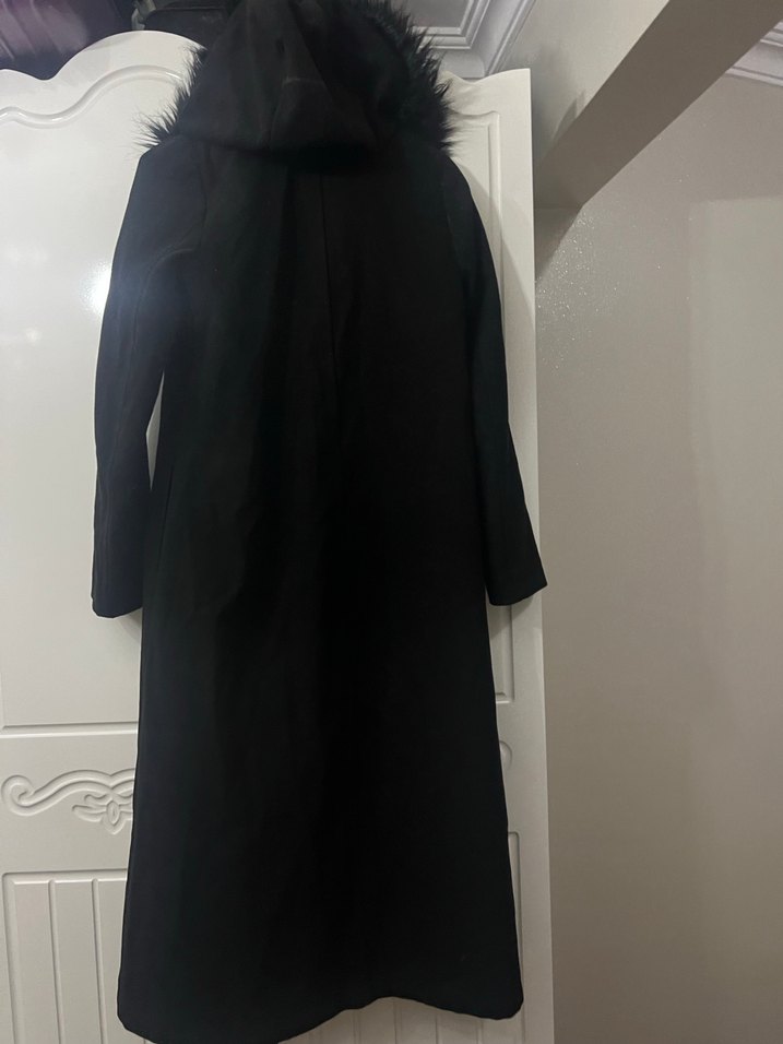 Kürk detaylı, siyah uzun kadın kabanı. Notlu yaka, uzun kollu ve rahat kesimdir. Yumuşak ve sıcak kumaştan yapılmıştır, günlük kullanım için uygundur.