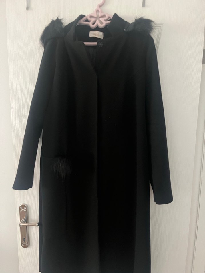 Kürk detaylı, siyah uzun kadın kaban. Minimalist ve gotik tarzda, regular fit ve uzun kolludur. Ofis kullanımı için uygundur ve yumuşak, sıcak kumaştan üretilmiştir.