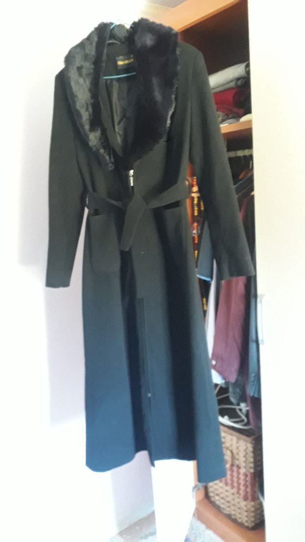 Kürk detaylı, uzun siyah kadife kaban, oturtmalı kesim ve uzun kolludur. Ofis kullanımı için uygun gotik tarzda tasarlanmıştır. kumaşı ince kaşe önden fermar lı hiç defosu yok yeni gibi temizdir . yaka kürklü çıkabilen .