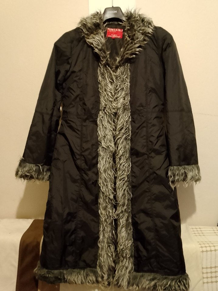 Siyah, uzun, dar kesim kadın kaban; yakasında, manşetlerinde ve etek ucunda sentetik kürk detayları bulunan gotik tarzda, uzun kollu ve kesimli yakalı bir modeldir.