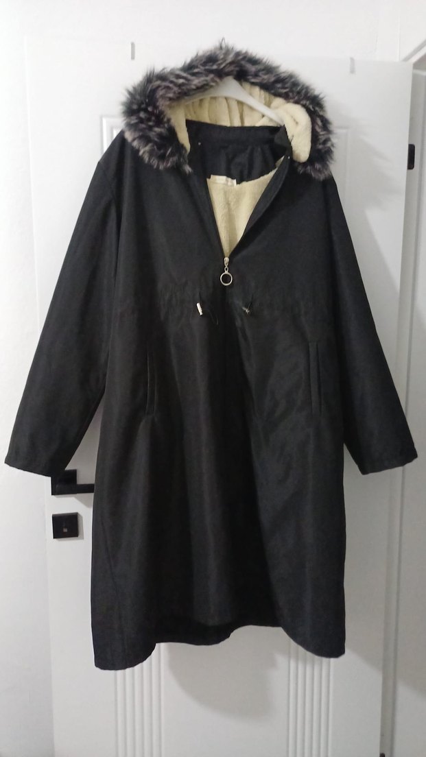 Siyah uzun kadın mont, bol kesim ve içi yumuşak kürklü fleece kumaştan yapılmıştır. Kapüşonunda kürk detayları ve notalı yaka bulunur. Günlük kullanıma uygundur.