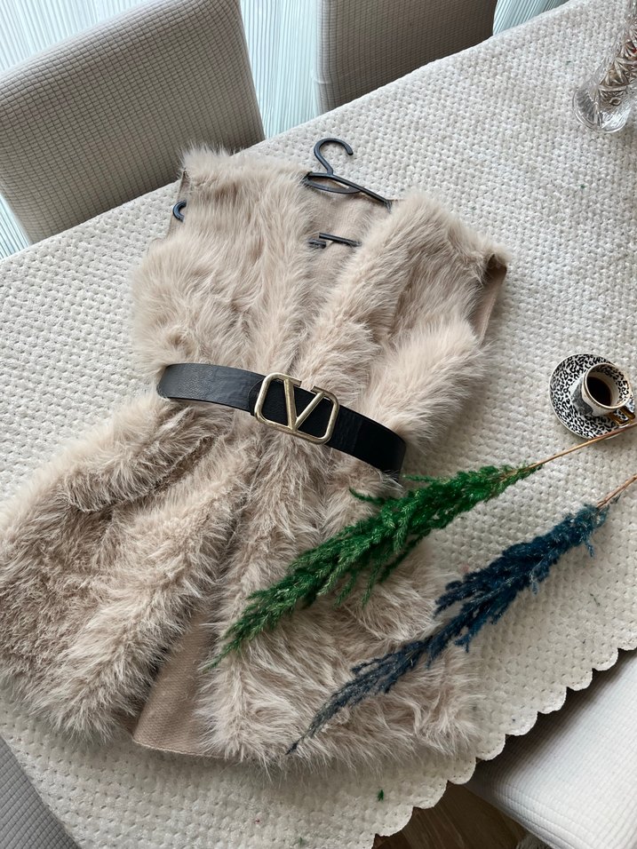 Yumuşak süet kumaştan, kürk detaylı ve nakışlı desenli, V yakalı ve kısa kesimli bohem tarzda dar kesim yelek. Kemer dahil değil