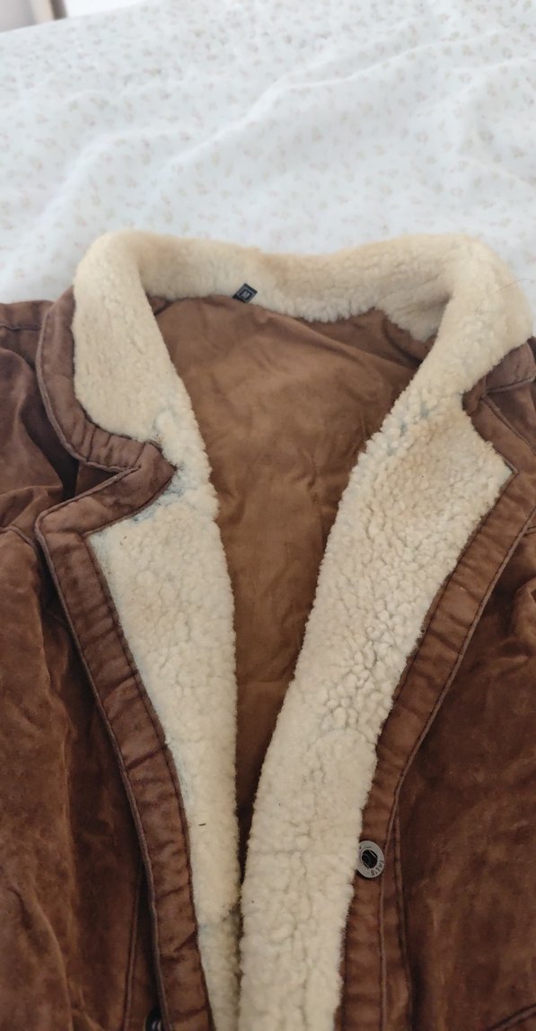 Kahverengi süet kumaştan yapılmış, kürk detaylı kışlık kaban. Notched lapel yakası ve rahat bir görünümü vardır.