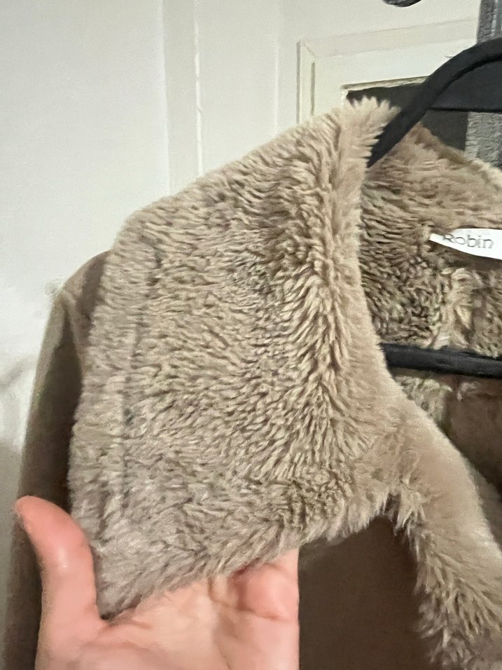 Gri süet kumaştan, kürk detaylı, yakalı ve uzun kollu, bohem tarzda, günlük kullanıma uygun kadın midi mont.