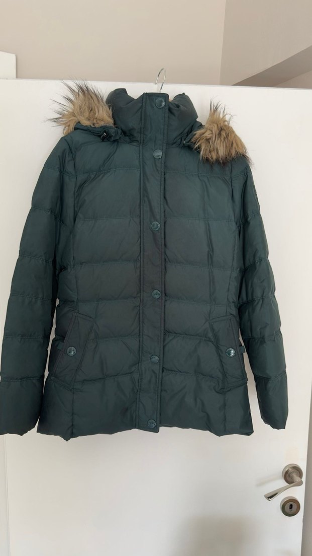 kapüşonlu, koyu yeşil kadın kışlık mont.Orijinaldir.Çok iyi durumdadır yırtığı vs yok. Üzerinde küçük bir leke var yıkamadım ama etiketinde 30 derecede yıkanabilir diyor.