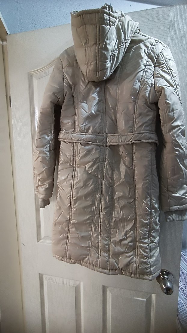 Kürk detaylı, notched lapel yakalı, sentetik kumaştan yapılmış, uzun ve fitted kesim bej kadın kışlık monttur. capkasi seyyar çıkabiliyor ve kalıbı biraz dardır