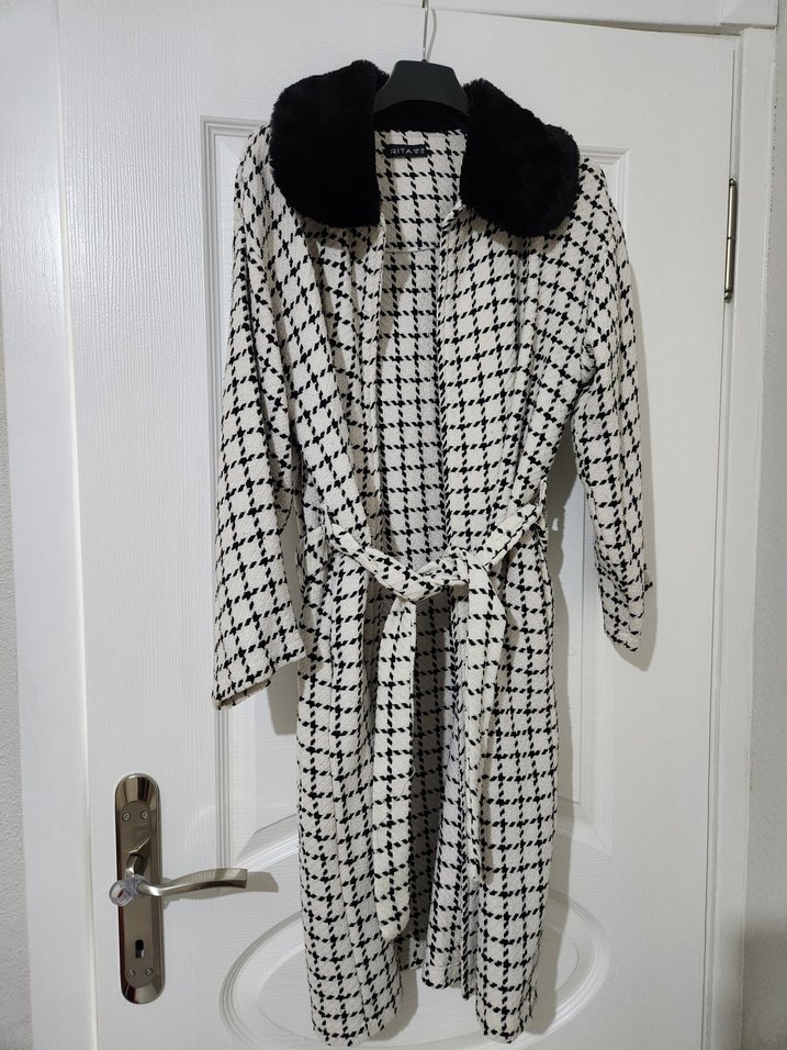 Kürk detaylı, ekose desenli uzun kadın hırka gibi