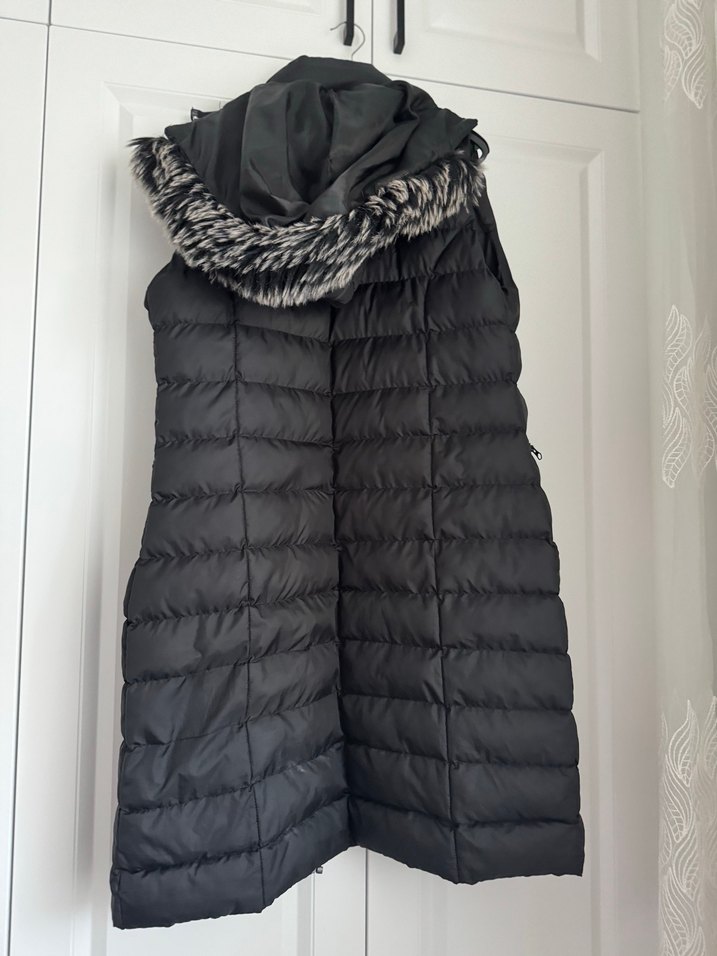 Yüksek yakalı, kolsuz, uzun ve fitted kesim kadın yeleği. Sentetik kumaş ve kürk detaylarıyla sokak stiline uygun, dış mekan kullanımı için ideal.