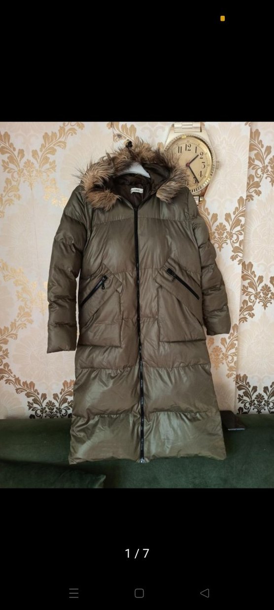 Kürk detaylı, sentetik kumaştan uzun haki kışlık kadın mont,düz kesim yakası çentikli ve uzun kolludur. Sokak stili için uygun. ❄️