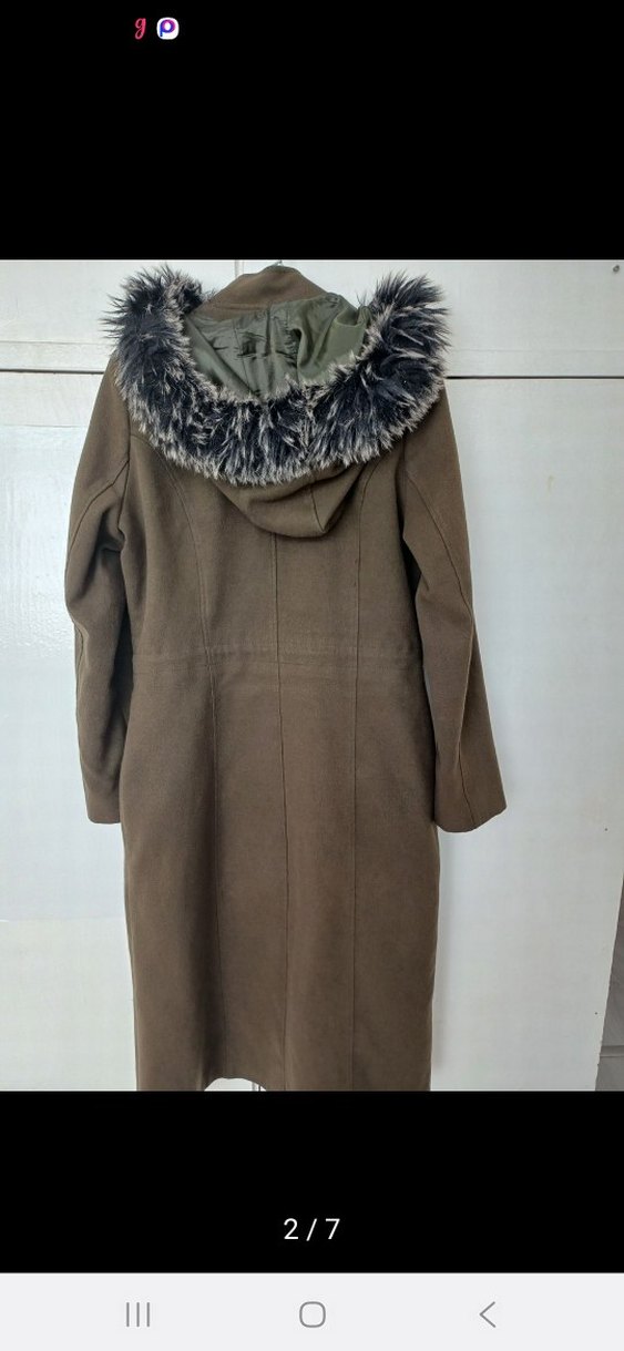 Kürk detaylı kapüşonlu, uzun kahverengi kadın kabanı, dar kesim ve uzun kolludur. Yumuşak ve sıcak kumaştan, günlük rahat sokak stili için uygundur. çok kalitelidir sadece 1 defa giyilmistir