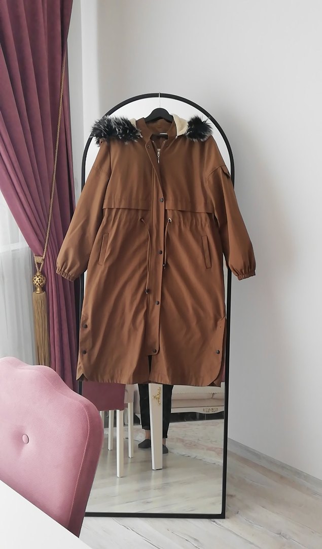 Kürk detaylı, uzun kahverengi kadın kabanı, bol kesimi ve kırlangıç yaka ile dikkat çeker. Yumuşak ve sıcak kumaştan yapılmıştır, günlük kullanıma uygundur.