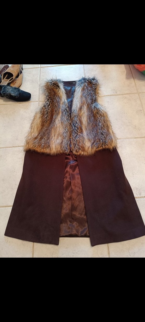 Kürk detaylı, uzun kahverengi süet yelek. Kolsuz ve beli oturan, klasik zarafet sunan goth tarzında, ofis için uygun rahat bir model.