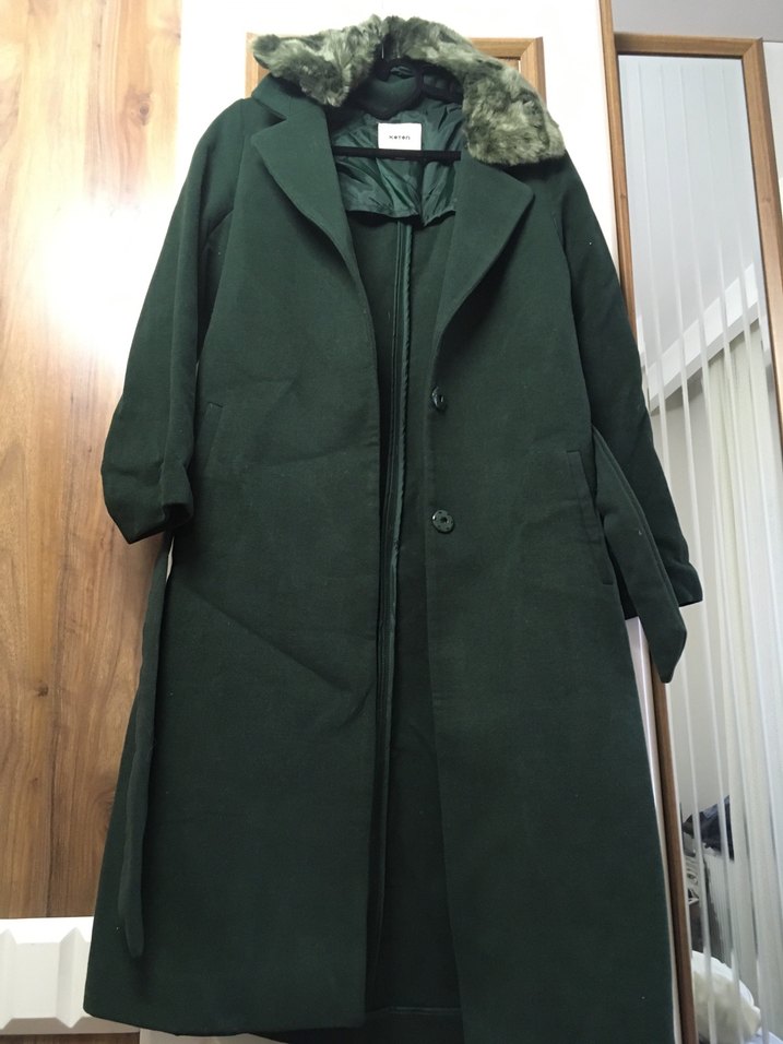 Kürk yakalı, düğmeli, uzun koyu yeşil kaban, soğuk havalar için yumuşak ve sıcak kumaştan üretilmiştir.