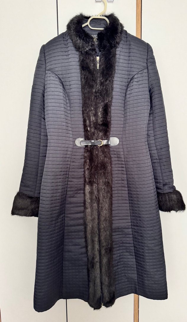 Kürk detaylı, kesimli uzun lacivert kaban. Yaka ve manşetlerde kürk tasarım. Boyu 100 cmdır.
