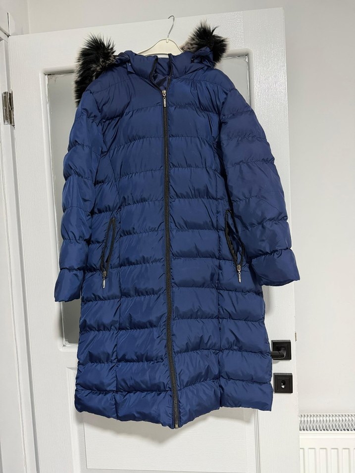 Kürk detaylı kapüşonlu, uzun ve fitted kesim lacivert kışlık mont. Yumuşak ve sıcak fleece kumaştan, outdoor için uygun sokak stili mont.