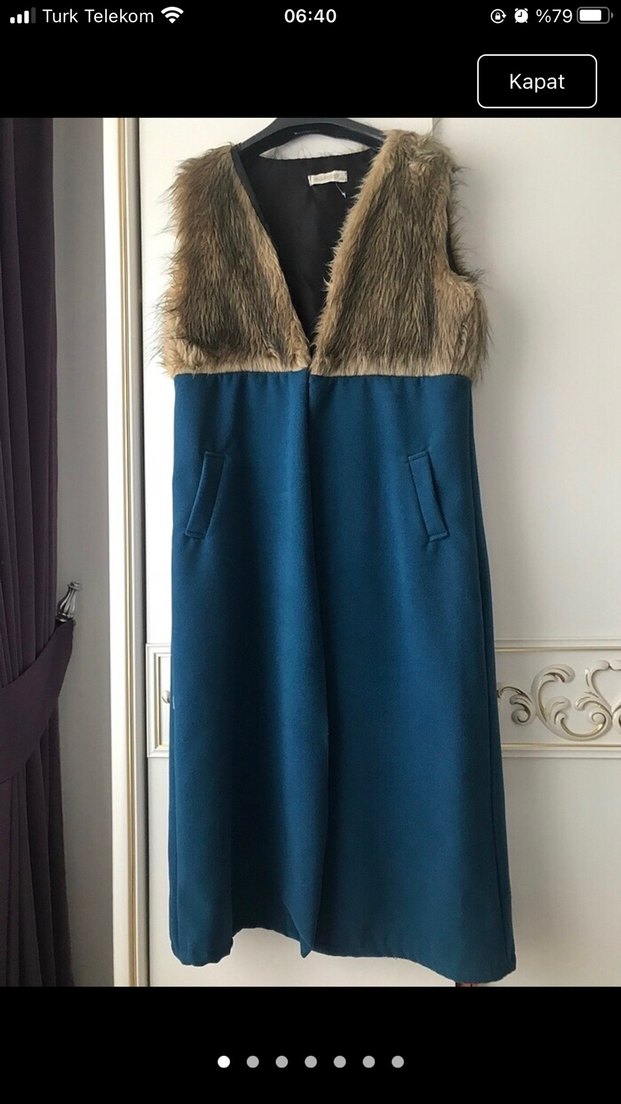 Kürk detaylı, askısız yaka ve regular kesime sahip, uzun mavi yelek. Sentetik kumaştan, günlük kullanıma uygun.ürün sıfır hıc gıyılmedı etıket yoktur