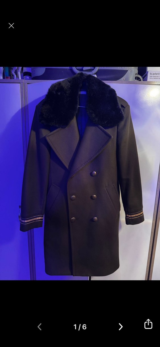 Uzun siyah kadın kaban, kürk detaylı kesik yaka ve uzun kolludur. Düz desensiz, ofis için uygun goth tarzında Parisian stilini yansıtır.