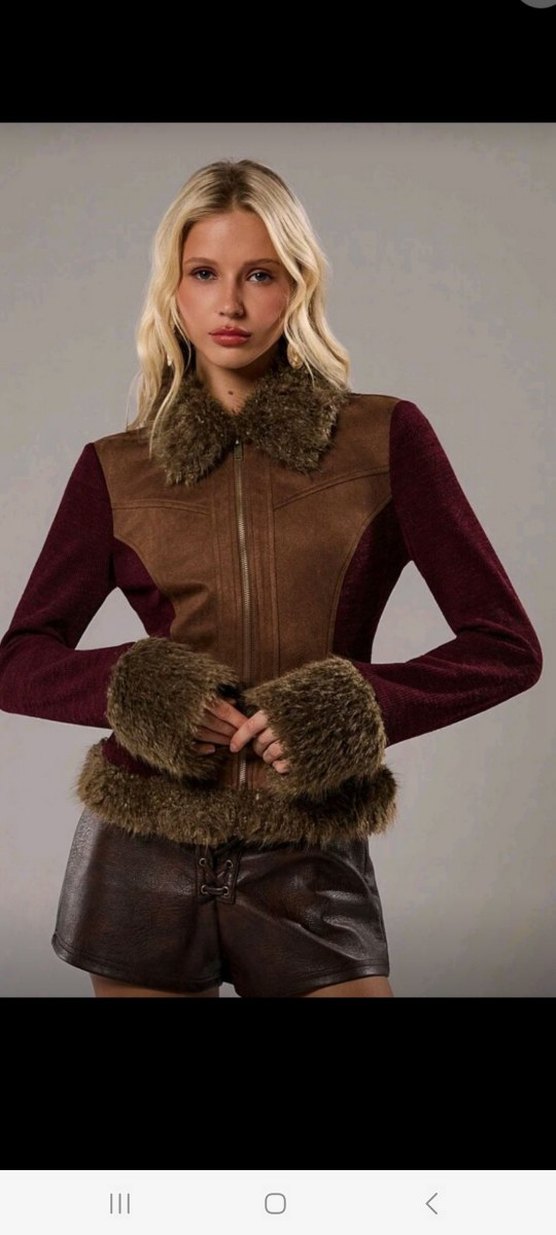Dar kesimli, kısa boy kadın ceket; uzun kollu, yakasında, manşetlerinde ve etek ucunda kürk detayları bulunan, koyu kahverengi deri ve rahat sokak stiliyle birleşiyor.