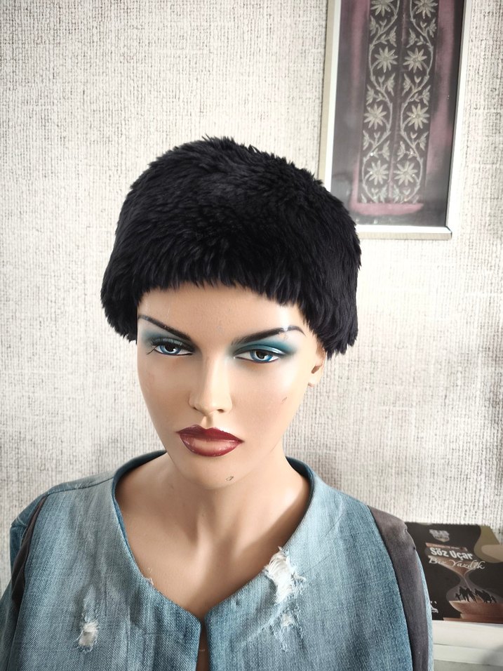 Koyu gri denim kumaştan, kürk detaylı vintage kadın şapkası. Trend belirleyici, avangart tarzda.