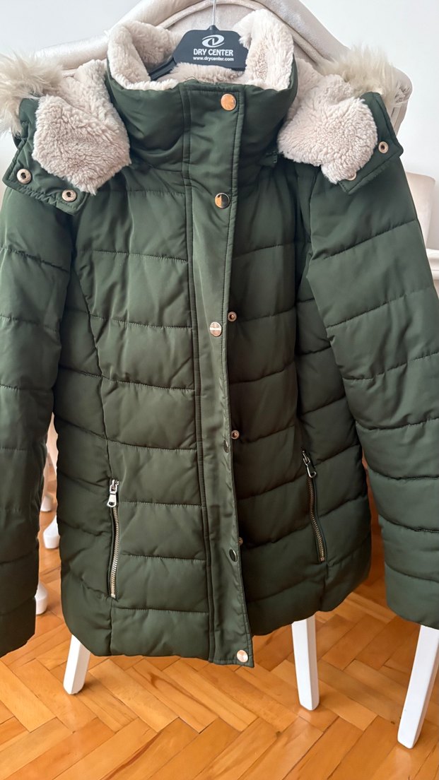 Fermuarlı cepleri ve kürk detaylı yaka kısmıyla yeşil, kesim kışlık mont. Orta uzunlukta, yumuşak ve sıcak kumaştan üretilmiştir. ❄️