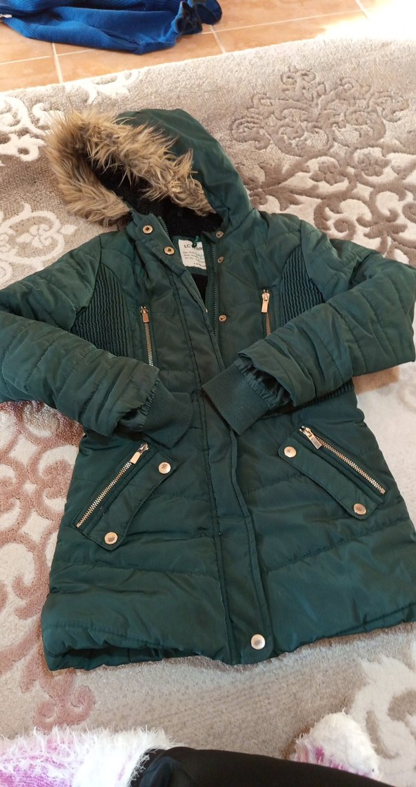 Kürk detaylı kapüşonlu, uzun kollu, yeşil kadın kışlık mont. Normal midi boy, fermuarlı cepler ve rahat, yumuşak kumaşla sıcak tutar. ❄️