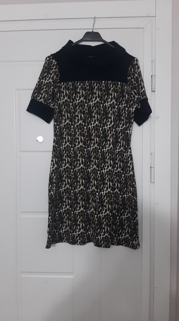 Sentetik kumaştan, kısa kollu ve yakalı, kürk detaylı, kahverengi zebra desenli, vücuda oturan midi elbise. Sokak modasına uygun.