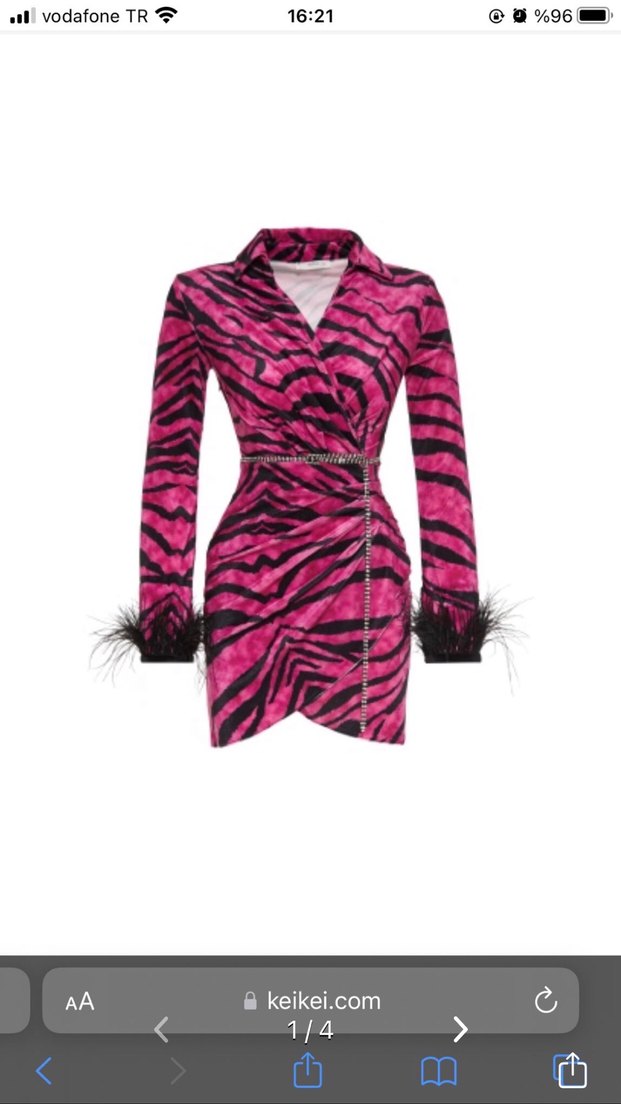 Uzun kollu, V yaka, pembe zebra desenli dar kesim mini elbise. Manşetlerde kürk detayları ve kuşaklı tasarım bulunur, cesur parti görünümleri için uygundur.