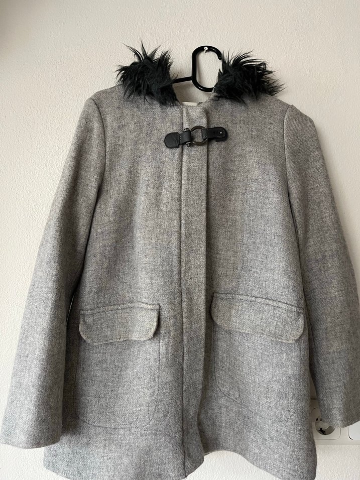 Kürk kapüşonlu, fermuarlı kapama ve cep detaylı gri kaban. Soğuk havalar için yumuşak ve sıcak kumaştan üretilmiştir.İçi astarlıdır.Cep detaylarında ufak deformeler mevcuttur.